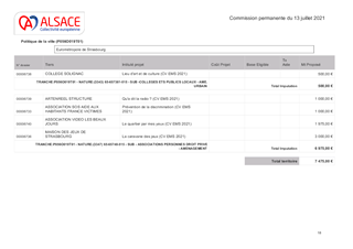 Conformément à la loi relative à la Ville et à la cohésion urbaine promulguée le 21 février 2014, le Département du Bas-Rhin a adopté lors de la réunion de son Assemblée Plénière du 6 juillet 2015 (CD/2015/84), le Contrat de Ville de l'Eurométropole de Strasbourg pour la période 2015-2020. Ce contrat a été conclu par le Département du Bas-Rhin et ses partenaires le 10 juillet 2015. La durée des Contrats de Ville a été prorogée de deux ans jusqu’en 2022 au titre de la Loi de Finances 2019, adoptée par l'Assemblée nationale le 20 décembre 2018. Le présent rapport a pour objet de proposer à la Commission Permanente de décider d’attribuer des subventions d'un montant total de 7 475 € concernant les projets pour lesquels la Collectivité européenne d'Alsace a été sollicitée au titre du fonds de développement urbain, dans le cadre de l'appel à projets 2021 du Contrat de Ville de l’Eurométropole de Strasbourg.