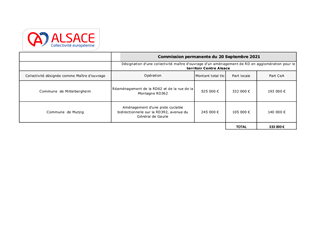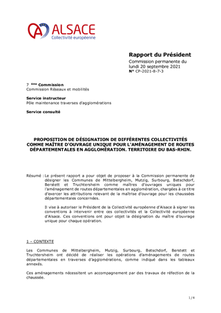 Le présent rapport a pour objet de proposer à la Commission permanente de désigner les Communes de Mittelbergheim, Mutzig, Surbourg, Betschdorf, Berstett et Truchtersheim comme maîtres d’ouvrages uniques pour l’aménagement de routes départementales en agglomération, chargées à ce titre d’exercer les attributions relevant de la maîtrise d’ouvrage pour les chaussées départementales concernées. Il vise à autoriser le Président de la Collectivité européenne d’Alsace à signer les conventions à intervenir entre ces collectivités et la Collectivité européenne d’Alsace. Ces conventions ont pour objet la désignation du maître d’ouvrage unique pour chaque opération.