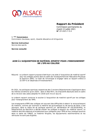 Le présent rapport propose d’attribuer une aide à l’acquisition de matériel sportif pour les collèges publics dans le cadre de l’enseignement de l’Education Physique et Sportive (EPS). Le total de l'enveloppe à engager dans ce rapport s'élève à 22 597 € en dépenses d'investissement.