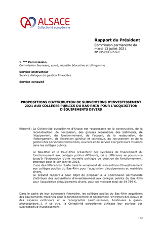 La Collectivité européenne d’Alsace est responsable de la construction, de la reconstruction, de l'extension, des grosses réparations des bâtiments, de l'équipement, du fonctionnement, de l’accueil, de la restauration, de l’hébergement, de l’entretien général et technique, du recrutement et de la gestion des personnels techniciens, ouvriers et de service exerçant leurs missions dans les collèges publics. Le Bas-Rhin et le Haut-Rhin présentent des systèmes de financement du fonctionnement aux collèges publics différents, cette différence se poursuivra jusqu’à l’élaboration d’une nouvelle politique de dotation de fonctionnement, attendue pour le 1er janvier 2023. L’une des différences réside dans le versement de subventions d’investissement aux collèges publics du Bas-Rhin pour l’acquisition d’équipements et matériels divers. Le présent rapport a pour objet de proposer à la Commission permanente d’attribuer des subventions d'investissement aux collèges publics du Bas-Rhin pour l'acquisition d'équipements divers, pour un montant total de 34 795 €.