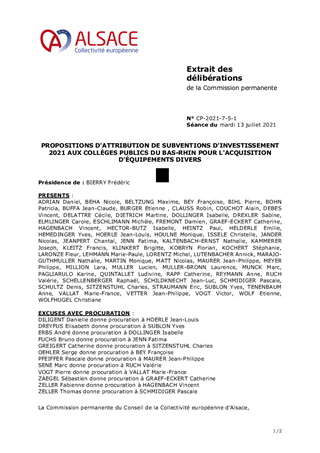PROPOSITIONS D'ATTRIBUTION DE SUBVENTIONS D'INVESTISSEMENT 2021 AUX COLLÈGES PUBLICS DU BAS-RHIN POUR L'ACQUISITION D'ÉQUIPEMENTS DIVERS