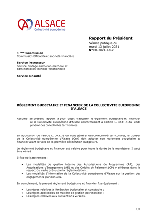 Le présent rapport a pour objet d'adopter le règlement budgétaire et financier de la Collectivité européenne d'Alsace conformément à l'article L. 3431-8 du code général des collectivités territoriales.