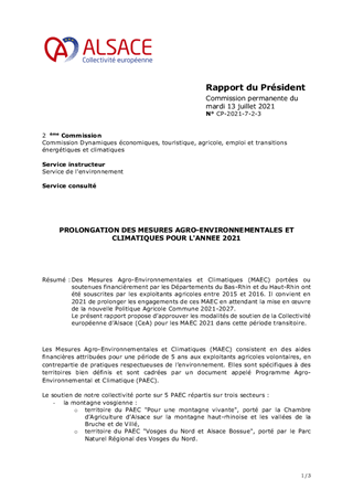 Des Mesures Agro-Environnementales et Climatiques (MAEC) portées ou soutenues financièrement par les Départements du Bas-Rhin et du Haut-Rhin ont été souscrites par les exploitants agricoles entre 2015 et 2016. Il convient en 2021 de prolonger les engagements de ces MAEC en attendant la mise en œuvre de la nouvelle Politique Agricole Commune 2021-2027. Le présent rapport propose d’approuver les modalités de soutien de la Collectivité européenne d’Alsace (CeA) pour les MAEC 2021 dans cette période transitoire.