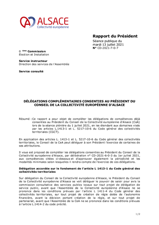 Ce rapport a pour objet de compléter les délégations de compétences déjà consenties au Président du Conseil de la Collectivité européenne d'Alsace (CeA) lors de la séance plénière du 1 juillet 2021, en les étendant aux domaines visés par les articles L.1413-1 et L. 5217-10-6 du Code général des collectivités territoriales (CGCT).