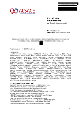 DÉLÉGATIONS COMPLÉMENTAIRES CONSENTIES AU PRÉSIDENT DU CONSEIL DE LA COLLECTIVITÉ EUROPÉENNE D'ALSACE