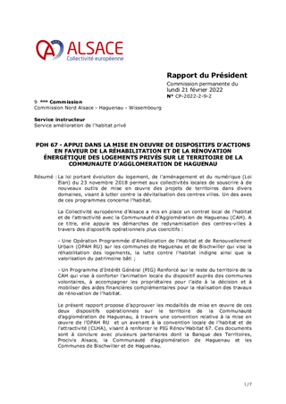 PDH 67 - APPUI DANS LA MISE EN OEUVRE DE DISPOSITIFS D'ACTIONS EN FAVEUR DE LA RÉHABILITATION ET DE LA RÉNOVATION ÉNERGÉTIQUE DES LOGEMENTS PRIVÉS SUR LE TERRITOIRE DE LA COMMUNAUTE D'AGGLOMERATION DE HAGUENAU