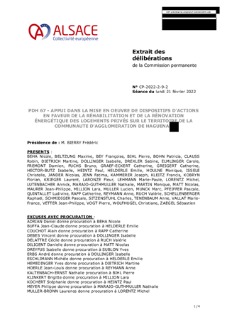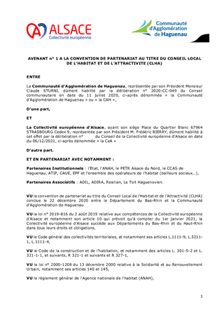 La loi portant évolution du logement, de l’aménagement et du numérique (Loi Elan) du 23 novembre 2018 permet aux collectivités locales de souscrire à de nouveaux outils de mise en œuvre des projets de territoires dans divers domaines, visant à lutter contre la dévitalisation des centres villes. Un des axes de ces programmes concerne l’habitat. La Collectivité européenne d’Alsace a mis en place un contrat local de l’habitat et de l’attractivité avec la Communauté d’Agglomération de Haguenau (CAH). A ce titre, elle appuie les démarches de redynamisation des centres-villes à travers des dispositifs opérationnels plus coercitifs : - Une Opération Programmée d'Amélioration de l'Habitat et de Renouvellement Urbain (OPAH RU) sur les communes de Haguenau et de Bischwiller qui vise la réhabilitation des logements, la lutte contre l'habitat indigne ainsi que la valorisation du patrimoine bâti ; - Un Programme d'Intérêt Général (PIG) Renforcé sur le reste du territoire de la CAH qui vise à conforter l’animation locale du dispositif auprès des communes volontaires, à accompagner les propriétaires pour l’aide à la décision et à mobiliser des aides financières complémentaires pour la réalisation des travaux de rénovation de l’habitat. Le présent rapport propose d’approuver les modalités de mise en œuvre de ces deux dispositifs opérationnels sur le territoire de la Communauté d’agglomération de Haguenau, à travers une convention relative à la mise en œuvre de l'OPAH RU et un avenant à la convention locale de l’habitat et de l’attractivité (CLHA), visant à renforcer le PIG Rénov'Habitat 67. Ces documents sont à conclure avec plusieurs partenaires dont la Banque des Territoires, Procivis Alsace, la Communauté d’agglomération de Haguenau et les Communes de Bischwiller et de Haguenau.