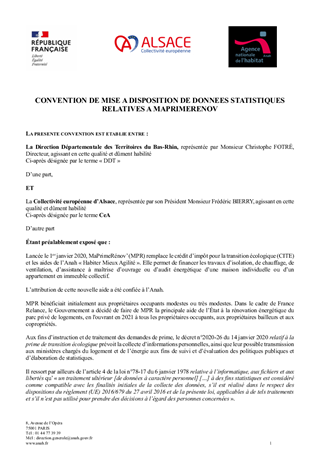 La Collectivité européenne d’Alsace doit disposer d'outils d’aide à la décision pour assurer le pilotage de ses politiques publiques en matière d'habitat privé. A ce titre, elle met en place un partenariat avec l'Agence Nationale de l'Habitat pour accéder aux données relatives au programme MaprimeRénov et des analyses pour disposer d'une vision globale de la réhabilitation des logements du parc privé à l'échelle alsacienne.