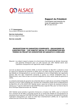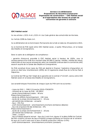 Le présent rapport propose à la Commission Permanente de décider d’accorder une garantie d’emprunt pour un prêt souscrit par CDC Habitat social pour l’opération d’acquisition de logements situés à Haguenau.