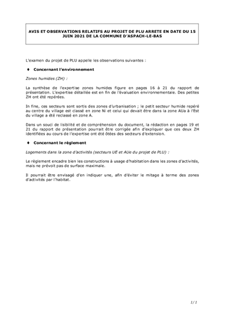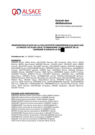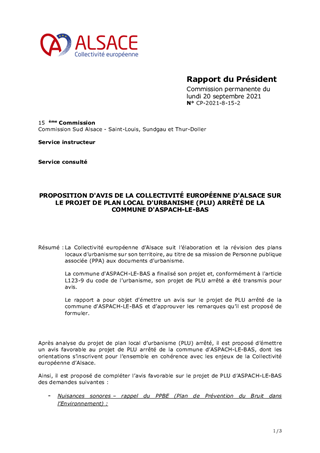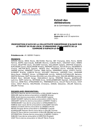 PROPOSITION D'AVIS DE LA COLLECTIVITÉ EUROPÉENNE D'ALSACE SUR LE PROJET DE PLAN LOCAL D'URBANISME (PLU) ARRÊTÉ DE LA COMMUNE D'ASPACH-LE-BAS