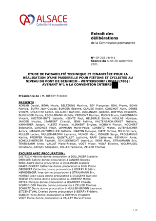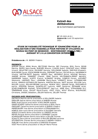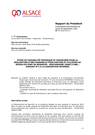 Le présent rapport a pour objet de proposer à la Commission permanente d’approuver les termes de l’avenant n°1 à la convention INTERREG V relative au projet d'Etude de faisabilité technique et financière pour la réalisation d'une passerelle pour piétons et cyclistes au niveau du pont de Beinheim - Wintersdorf (RD87/L78b). Cet avenant vise à : - prolonger la période de réalisation du projet d’un an, soit jusqu'au 31 décembre 2022; - modifier le plan de financement, sans incidence financière.
