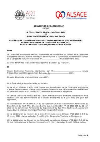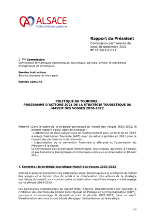 Dans le cadre de la stratégie touristique du massif des Vosges 2020-2022, le présent rapport a pour objet de proposer : - L’attribution de deux subventions de fonctionnement pour un total de 42 790 € à Alsace Destination Tourisme (ADT) pour les actions portées en 2021 pour le compte des partenaires institutionnels ; - L’approbation de la convention financière y afférente et l’autorisation du Président à la signer. La Commission aux dynamiques économiques, touristiques, agricoles, à l'emploi et aux transitions énergétiques et climatiques a émis un avis favorable le 30 août 2021.