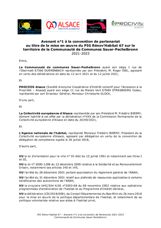 PDH67 - APPROBATION D'UN AVENANT A UNE CONVENTION DE PARTENARIAT CONCLUE AVEC LA COMMUNAUTE DE COMMUNES SAUER PECHELBRONN AU TITRE DE LA MISE EN OEUVRE DU PIG RENOV'HABITAT