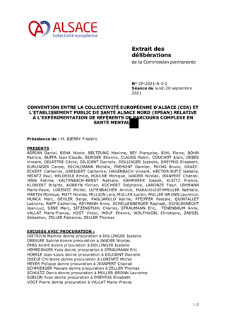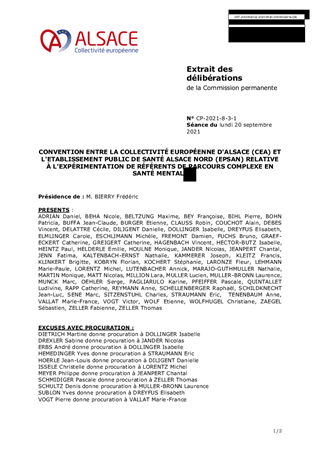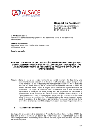 Dans le cadre du projet territorial de santé mentale du Bas-Rhin, une expérimentation de création de métiers de « référents de parcours complexe en santé mentale » a été portée conjointement par l'Etablissement Public de Santé d’Alsace du Nord (EPSAN) et la Collectivité européenne d'Alsace. Retenu au niveau national dans l’appel à projets pour l’innovation organisationnelle en psychiatrie, ce projet a bénéficié d’un financement sur 3 ans permettant notamment la création de deux postes sur les territoires de Haguenau – Wissembourg et de Strasbourg - Eurométropole, dédiés à la coordination et à l’accompagnement renforcé de personnes présentant des troubles psychiatriques afin d’éviter, en prévention, des (ré)hospitalisations. Le présent rapport a pour objet de proposer à la Commission permanente d’approuver les termes de la convention à conclure avec l’EPSAN pour la mise en œuvre de l’expérimentation.