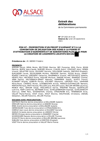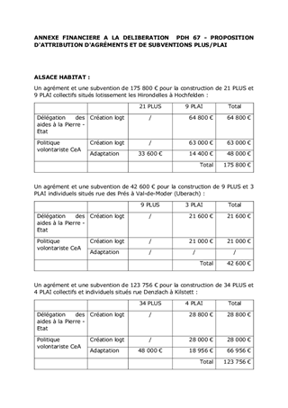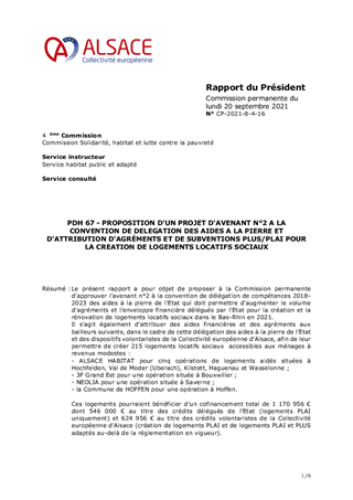 Le présent rapport a pour objet de proposer à la Commission permanente d'approuver l'avenant n°2 à la convention de délégation de compétences 2018-2023 des aides à la pierre de l'Etat qui doit permettre d'augmenter le volume d'agréments et l'enveloppe financière délégués par l'Etat pour la création et la rénovation de logements locatifs sociaux dans le Bas-Rhin en 2021. Il s'agit également d’attribuer des aides financières et des agréments aux bailleurs suivants, dans le cadre de cette délégation des aides à la pierre de l'Etat et des dispositifs volontaristes de la Collectivité européenne d'Alsace, afin de leur permettre de créer 215 logements locatifs sociaux accessibles aux ménages à revenus modestes : - ALSACE HABITAT pour cinq opérations de logements aidés situées à Hochfelden, Val de Moder (Uberach), Kilstett, Haguenau et Wasselonne ; - 3F Grand Est pour une opération située à Bouxwiller ; - NEOLIA pour une opération située à Saverne ; - la Commune de HOFFEN pour une opération à Hoffen. Ces logements pourraient bénéficier d’un cofinancement total de 1 170 956 € dont 546 000 € au titre des crédits délégués de l’Etat (logements PLAI uniquement) et 624 956 € au titre des crédits volontaristes de la Collectivité européenne d'Alsace (création de logements PLAI et de logements PLAI et PLUS adaptés au-delà de la réglementation en vigueur).