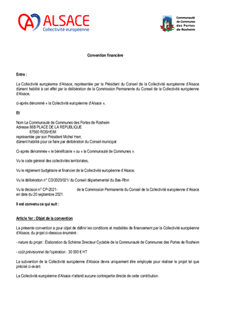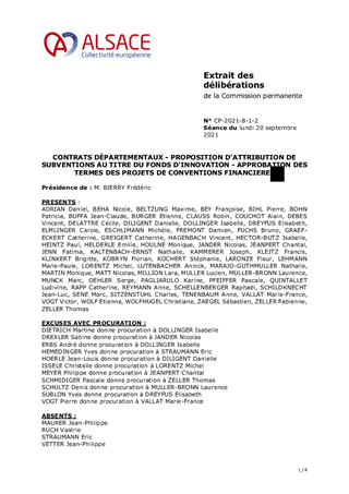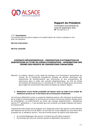 Le présent rapport a pour objet de proposer à la Commission permanente du Conseil de la Collectivité européenne d'Alsace de décider d'attribuer des subventions de fonctionnement aux Communes et aux groupements de Communes dans le cadre des contrats départementaux, au titre du Fonds d'innovation territoriale pour un montant de 17 130 € et d'approuver les termes des projets de conventions financières annexées au présent rapport.