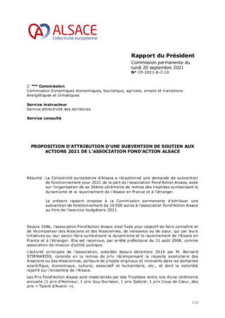 La Collectivité européenne d’Alsace a réceptionné une demande de subvention de fonctionnement pour 2021 de la part de l'association Fond'Action Alsace, axée sur l'organisation de sa 34ème cérémonie de remise des trophées symbolisant le dynamisme et le rayonnement de l’Alsace en France et à l’étranger. Le présent rapport propose à la Commission permanente d'attribuer une subvention de fonctionnement de 10 000 euros à l'association Fond'Action Alsace au titre de l'exercice budgétaire 2021.