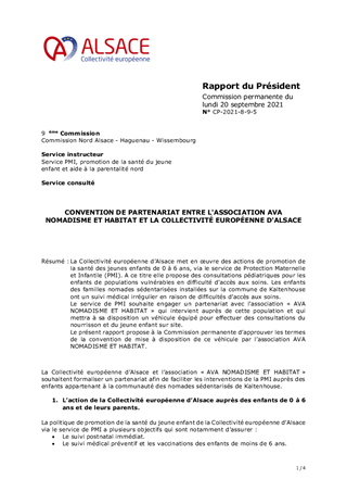 La Collectivité européenne d’Alsace met en œuvre des actions de promotion de la santé des jeunes enfants de 0 à 6 ans, via le service de Protection Maternelle et Infantile (PMI). A ce titre elle propose des consultations pédiatriques pour les enfants de populations vulnérables en difficulté d’accès aux soins. Les enfants des familles nomades sédentarisées installées sur la commune de Kaltenhouse ont un suivi médical irrégulier en raison de difficultés d’accès aux soins. Le service de PMI souhaite engager un partenariat avec l’association « AVA NOMADISME ET HABITAT » qui intervient auprès de cette population et qui mettra à sa disposition un véhicule équipé pour effectuer des consultations du nourrisson et du jeune enfant sur site. Le présent rapport propose à la Commission permanente d’approuver les termes de la convention de mise à disposition de ce véhicule par l’association AVA NOMADISME ET HABITAT.