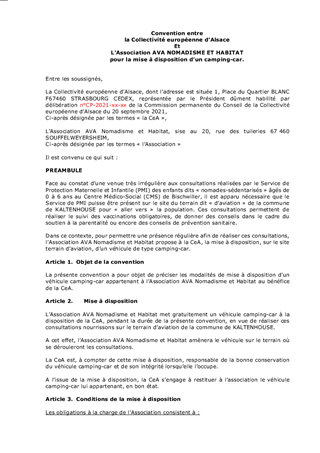 CONVENTION DE PARTENARIAT ENTRE L'ASSOCIATION AVA NOMADISME ET HABITAT ET LA COLLECTIVITÉ EUROPÉENNE D'ALSACE