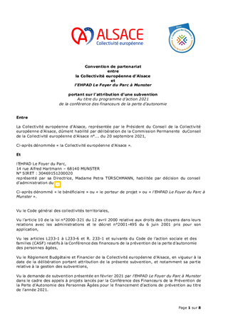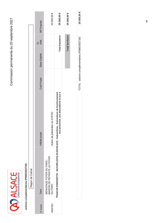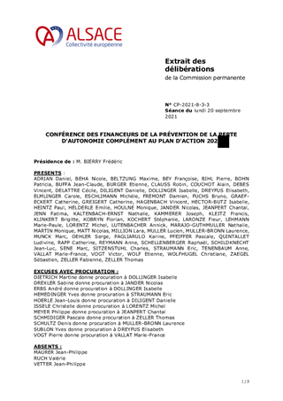 Suite à l’avis de la Conférence des Financeurs, il vous est proposé de valider une programmation complémentaire au plan d’action 2021 arrêté par la Commission permanente lors de ses séances des 31 mai et 13 juillet 2021. Le montant total de la subvention de fonctionnement complémentaire allouée s’élève à 25 000 € pour 3 actions. Ces dépenses sont entièrement couvertes par une recette de la Caisse Nationale de Solidarité pour l’Autonomie. Par ailleurs, la Caisse Régionale d'Assurance Retraite et de la Santé au Travail (CARSAT) d'Alsace-Moselle a souhaité soutenir le projet de ligne d’écoute et de soutien psychologique porté par la Collectivité européenne d’Alsace par l’octroi d’une subvention de 5 300 €. Afin de pouvoir percevoir cette subvention, il est nécessaire d’approuver la convention préparée par la CARSAT.