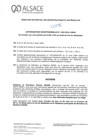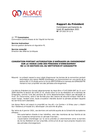Le présent rapport a pour objet d’approuver les termes de la convention portant autorisation aux époux MAIRE d’aménager un cheminement sur une partie de la section RD 11 VI située entre le Col du WETTSTEIN et le hameau de GIRAGOUTTE menant à leur propriété lors des périodes d’enneigement.