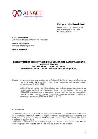 Le regroupement des services de la Solidarité de Cernay dans le bâtiment de l’ancienne gare SNCF a fait l’objet d’une validation par la Commission permanente du 6 juillet 2018. L’objectif de ce rapport est l’approbation par la Commission permanente de l’avant-projet définitif de l’opération établi par le Cabinet d’architecture HERRGOTT, mandataire du groupement conjoint, pour un coût prévisionnel des travaux de 999 170 € HT, correspondant à un montant d’opération global, fin d’opération septembre 2022, de 1 500 718 € TTC.
