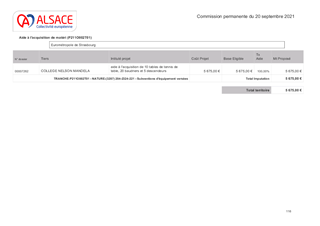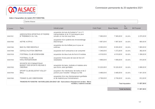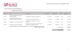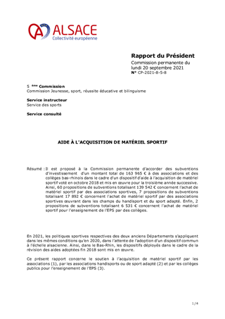 Il est proposé à la Commission permanente d'accorder des subventions d'investissement d'un montant total de 163 965 € à des associations et des collèges bas-rhinois dans le cadre d'un dispositif d'aide à l'acquisition de matériel sportif voté en octobre 2018 et mis en œuvre pour la troisième année successive. Ainsi, 60 propositions de subventions totalisant 139 542 € concernent l'achat de matériel sportif par des associations sportives, 7 propositions de subventions totalisant 17 892 € concernent l'achat de matériel sportif par des associations sportives œuvrant dans les champs du handisport et du sport adapté. Enfin, 2 propositions de subventions totalisant 6 531 € concernent l'achat de matériel sportif pour l'enseignement de l'EPS par des collèges.