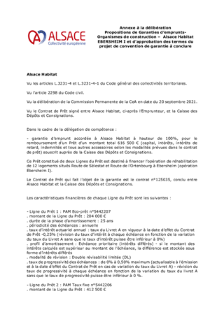 Le présent rapport propose à la Commission permanente de décider d’accorder une garantie d’emprunt pour un prêt souscrit par Alsace Habitat pour l’opération de réhabilitation de logements situés à Ebersheim.