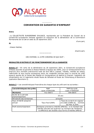 PROPOSITIONS DE GARANTIES D'EMPRUNTS - ORGANISMES DE CONSTRUCTION -ALSACE HABITAT EBERSHEIM I ET D'APPROBATION DES TERMES DU PROJET DE CONVENTION DE GARANTIE À CONCLURE