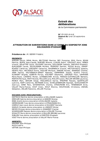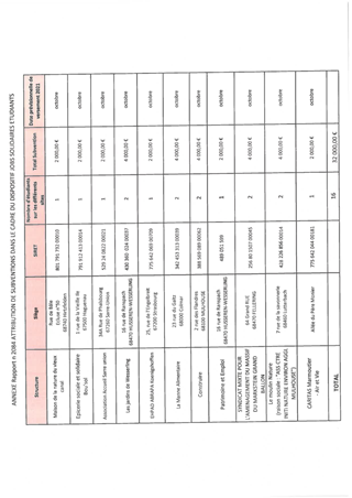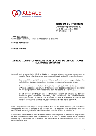 A la crise sanitaire liée à la COVID 19, vient se rajouter une crise économique et sociale. Cette crise touche de nouveaux publics et particulièrement les jeunes. Les associations caritatives sont mobilisées et font face à une augmentation des sollicitations dans un contexte en terme de ressources humaines tendu. Pour soutenir les associations et étudiants précaires, la Collectivité européenne d’Alsace a adopté le 25 janvier 2021 le dispositif de jobs solidaires aux étudiants et son élargissement dans le cadre du plan de rebond le 19 avril 2021. Il est proposé d’attribuer aux 11 structures figurant en annexe, au titre du dispositif jobs solidaires étudiants, les subventions de fonctionnement correspondantes à hauteur d’un montant de 2000 € forfaitaire maximum par contrat conclu avec un étudiant, soit un montant total de de 32 000 €.