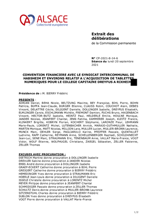 CONVENTION FINANCIERE AVEC LE SYNDICAT INTERCOMMUNAL DE HABSHEIM ET ENVIRONS RELATIF A L'ACQUISITION DE TABLETTES NUMERIQUES POUR LE COLLEGE CAPITAINE DREYFUS A RIXHEIM.