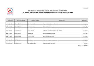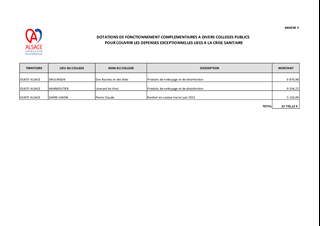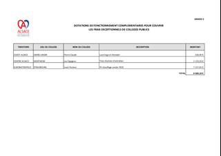 Le Bas-Rhin et le Haut-Rhin présentent des systèmes de dotations de fonctionnement aux collèges publics différents qui se poursuivront jusqu’à l’élaboration d’une nouvelle politique de dotation de fonctionnement, attendue pour le 1er janvier 2023. L’une des différences majeures réside dans le versement d'une dotation globale de fonctionnement (DGF) unique pour les collèges haut-rhinois et d'un versement de DGF assortie de dotations de fonctionnement complémentaires pour les collèges bas-rhinois. Ce rapport propose une série de dotations de fonctionnement complémentaires pour les collèges du Bas-Rhin, notamment pour prendre en compte les effets de la crise sanitaire. Au total, 59 388,31 € sont identifiés et proposés dans ce rapport pour accompagner une partie des collèges du Bas-Rhin et du Haut-Rhin.