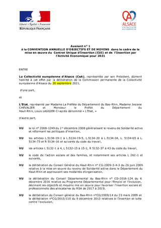 La Collectivité Européenne d'Alsace a pour objectif de mener une politique active en faveur de l'insertion et de l'accès à l'emploi de tous les alsaciens. Parmi les leviers à mobiliser, la politique des contrats aidés est une opportunité pour dynamiser le recrutement des allocataires du Revenu de Solidarité Active, développer leurs compétences dans un cadre de travail et répondre à l'objectif de ne laisser personne sur le bord de la route, notamment les habitants des quartiers prioritaires de la ville (QPV). La Collectivité Européenne d'Alsace consacre plus de 9M€ aux contrat aidés. Eu égard au contexte économique, il est proposé de porter une attention particulière en faveur des publics résidant dans les QPV et de s'engager par avenant à la convention d'objectifs et de moyens (CAOM) à signer 100 Contrats Emploi Compétence / Contrats d’Accompagnement dans l’emploi au profit de ce public spécifique. Cet avenant serait sans incidence financière. Ce rapport a pour objet d'approuver cet avenant qui prévoit par ailleurs d'acter la prescription de 10 contrats supplémentaires portés par la CeA au bénéfice des collèges pour répondre aux besoins des services.