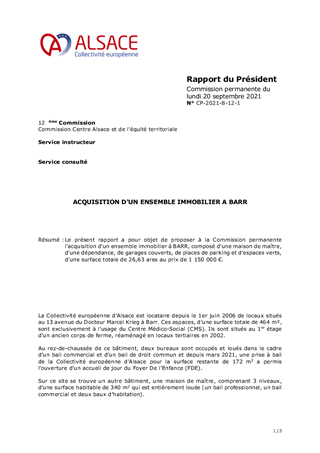 Le présent rapport a pour objet de proposer à la Commission permanente l'acquisition d'un ensemble immobilier à BARR, composé d'une maison de maître, d'une dépendance, de garages couverts, de places de parking et d'espaces verts, d'une surface totale de 26,63 ares au prix de 1 150 000 €.