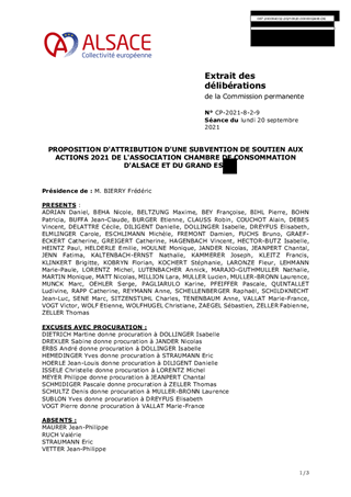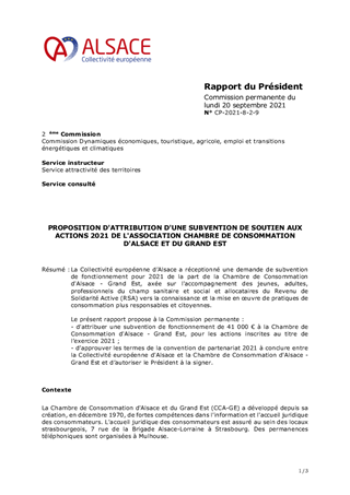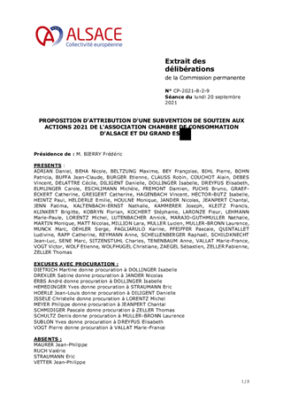 PROPOSITION D'ATTRIBUTION D'UNE SUBVENTION DE SOUTIEN AUX ACTIONS 2021 DE L'ASSOCIATION CHAMBRE DE CONSOMMATION D'ALSACE ET DU GRAND EST