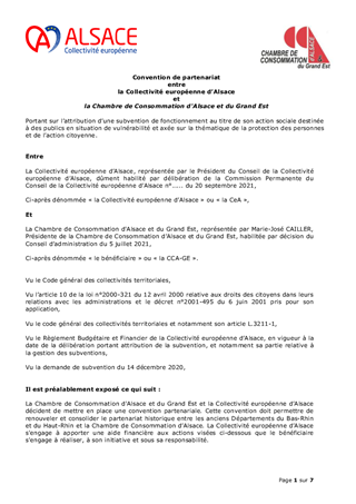La Collectivité européenne d’Alsace a réceptionné une demande de subvention de fonctionnement pour 2021 de la part de la Chambre de Consommation d'Alsace - Grand Est, axée sur l'accompagnement des jeunes, adultes, professionnels du champ sanitaire et social et allocataires du Revenu de Solidarité Active (RSA) vers la connaissance et la mise en œuvre de pratiques de consommation plus responsables et citoyennes. Le présent rapport propose à la Commission permanente : - d'attribuer une subvention de fonctionnement de 41 000 € à la Chambre de Consommation d'Alsace - Grand Est, pour les actions inscrites au titre de l’exercice 2021 ; - d’approuver les termes de la convention de partenariat 2021 à conclure entre la Collectivité européenne d'Alsace et la Chambre de Consommation d'Alsace - Grand Est et d’autoriser le Président à la signer.