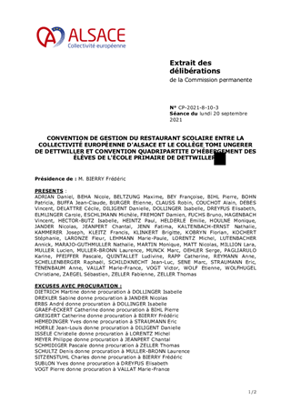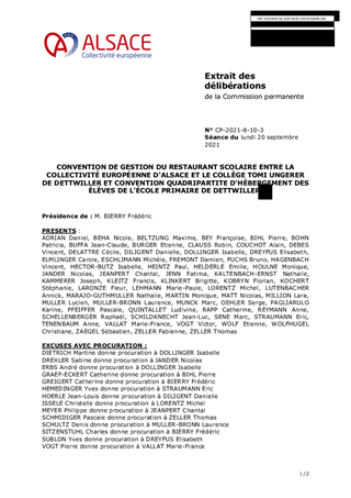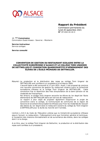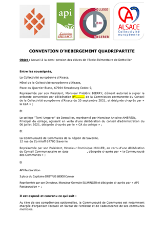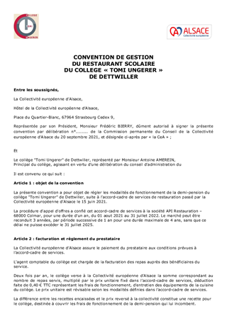 CONVENTION DE GESTION DU RESTAURANT SCOLAIRE ENTRE LA COLLECTIVITÉ EUROPÉENNE D'ALSACE ET LE COLLÈGE TOMI UNGERER DE DETTWILLER ET CONVENTION QUADRIPARTITE D'HÉBERGEMENT DES ÉLÈVES DE L'ÉCOLE PRIMAIRE DE DETTWILLER.