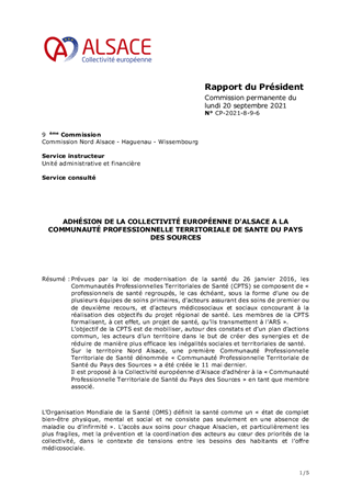 Prévues par la loi de modernisation de la santé du 26 janvier 2016, les Communautés Professionnelles Territoriales de Santé (CPTS) se composent de « professionnels de santé regroupés, le cas échéant, sous la forme d’une ou de plusieurs équipes de soins primaires, d’acteurs assurant des soins de premier ou de deuxième recours, et d’acteurs médicosociaux et sociaux concourant à la réalisation des objectifs du projet régional de santé. Les membres de la CPTS formalisent, à cet effet, un projet de santé, qu’ils transmettent à l’ARS ». L’objectif de la CPTS est de mobiliser, autour des constats et d’un plan d’actions commun, les acteurs d’un territoire dans le but de créer des synergies et de réduire de manière plus efficace les inégalités sociales et territoriales de santé. Sur le territoire Nord Alsace, une première Communauté Professionnelle Territoriale de Santé dénommée « Communauté Professionnelle Territoriale de Santé du Pays des Sources » a été créée le 11 mai dernier. Il est proposé à la Collectivité européenne d’Alsace d’adhérer à la « Communauté Professionnelle Territoriale de Santé du Pays des Sources » en tant que membre associé.