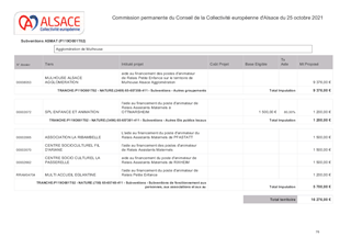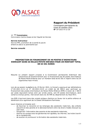 Le présent rapport propose à la Commission permanente d'attribuer des subventions de fonctionnement pour le financement de 49 postes d'animateurs de Relais Petite Enfance pour un montant total de 63 301 € réparti entre les 24 organismes haut-rhinois.