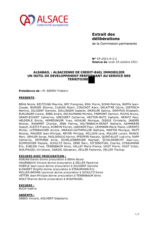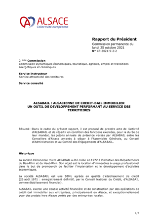 Dans le cadre du présent rapport, il est proposé de prendre acte de l’activité d’ALSABAIL et de répartir en condition des fonctions exercées, pour la durée de leur mandat, les jetons annuels de présence versés par ALSABAIL entre les Conseillers d'Alsace amenés à siéger à l’Assemblée Générale, au Conseil d’Administration et au Comité des Engagements d’ALSABAIL.