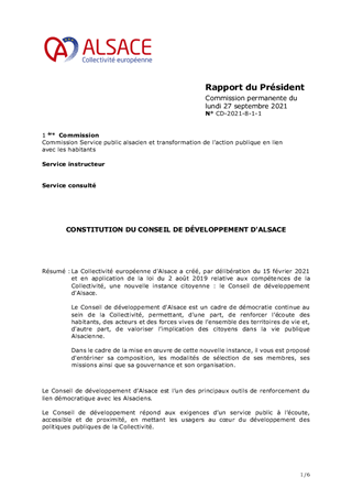 La Collectivité européenne d'Alsace a créé, par délibération du 15 février 2021 et en application de la loi du 2 août 2019 relative aux compétences de la Collectivité, une nouvelle instance citoyenne : le Conseil de développement d'Alsace. Le Conseil de développement d'Alsace est un cadre de démocratie continue au sein de la Collectivité, permettant, d'une part, de renforcer l’écoute des habitants, des acteurs et des forces vives de l’ensemble des territoires de vie et, d'autre part, de valoriser l’implication des citoyens dans la vie publique Alsacienne. Dans le cadre de la mise en œuvre de cette nouvelle instance, il vous est proposé d'entériner sa composition, les modalités de sélection de ses membres, ses missions ainsi que sa gouvernance et son organisation.