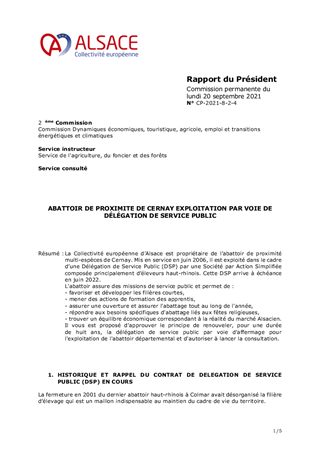 La Collectivité européenne d’Alsace est propriétaire de l’abattoir de proximité multi-espèces de Cernay. Mis en service en juin 2006, il est exploité dans le cadre d’une Délégation de Service Public (DSP) par une Société par Action Simplifiée composée principalement d’éleveurs haut-rhinois. Cette DSP arrive à échéance en juin 2022. L'abattoir assure des missions de service public et permet de : - favoriser et développer les filières courtes, - mener des actions de formation des apprentis, - assurer une ouverture et assurer l'abattage tout au long de l'année, - répondre aux besoins spécifiques d'abattage liés aux fêtes religieuses, - trouver un équilibre économique correspondant à la réalité du marché Alsacien. Il vous est proposé d'approuver le principe de renouveler, pour une durée de huit ans, la délégation de service public par voie d’affermage pour l'exploitation de l'abattoir départemental et d'autoriser à lancer la consultation.