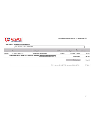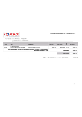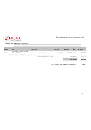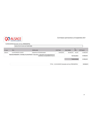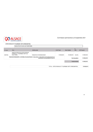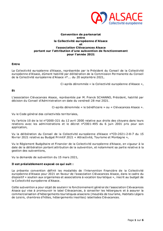 La Collectivité européenne d’Alsace a réceptionné des demandes de subventions dans le cadre du dispositif « soutien aux organismes et associations à vocation touristique », de la part de : - Clévacances Alsace, - l’Association des Gîtes Ruraux de France et du Tourisme Vert du Haut-Rhin, - La Ronde des Fêtes, - l’Association Le Sundgau, Routes de la Carpe Frite, - et l’Association Départementale du Club Vosgien du Haut-Rhin, pour leur fonctionnement en 2021. Le présent rapport propose à la Commission permanente d'attribuer des subventions de fonctionnement pour un total de 94 750 €, comme suit : - 30 000 € à l’association Clévacances Alsace, - 15 000 € à l’Association des Gîtes Ruraux de France et du Tourisme Vert du Haut-Rhin, - 7 750 € à l’Association La Ronde des Fêtes, - 6 000 € à l’Association Le Sundgau, Routes de la Carpe Frite, - et 36 000 € à l’Association Départementale du Club Vosgien du Haut-Rhin.