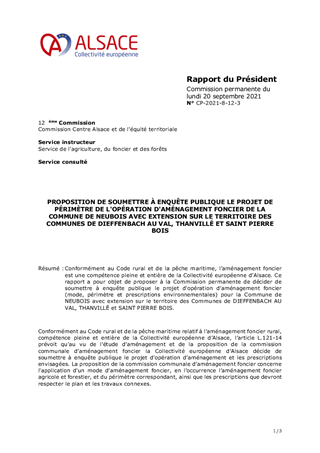 Conformément au Code rural et de la pêche maritime, l’aménagement foncier est une compétence pleine et entière de la Collectivité européenne d’Alsace. Ce rapport a pour objet de proposer à la Commission permanente de décider de soumettre à enquête publique le projet d'opération d’aménagement foncier (mode, périmètre et prescriptions environnementales) pour la Commune de NEUBOIS avec extension sur le territoire des Communes de DIEFFENBACH AU VAL, THANVILLÉ et SAINT PIERRE BOIS.