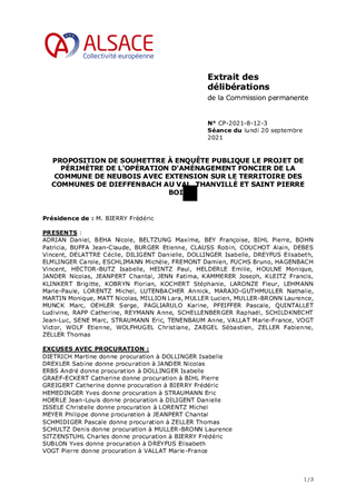 PROPOSITION DE SOUMETTRE À ENQUÊTE PUBLIQUE LE PROJET DE PÉRIMÈTRE DE L'OPÉRATION D'AMÉNAGEMENT FONCIER DE LA COMMUNE DE NEUBOIS AVEC EXTENSION SUR LE TERRITOIRE DES COMMUNES DE DIEFFENBACH AU VAL, THANVILLÉ ET SAINT PIERRE BOIS