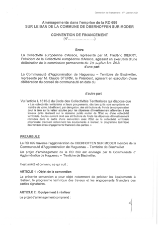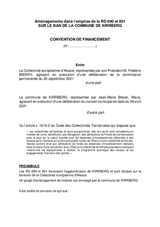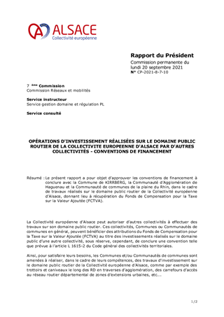 Le présent rapport a pour objet d’approuver les conventions de financement à conclure avec la Commune de KIRRBERG, la Communauté d’Agglomération de Haguenau et la Communauté de communes de la plaine du Rhin, dans le cadre de travaux réalisés sur le domaine public routier de la Collectivité européenne d’Alsace, donnant lieu à récupération du Fonds de Compensation pour la Taxe sur la Valeur Ajoutée (FCTVA).