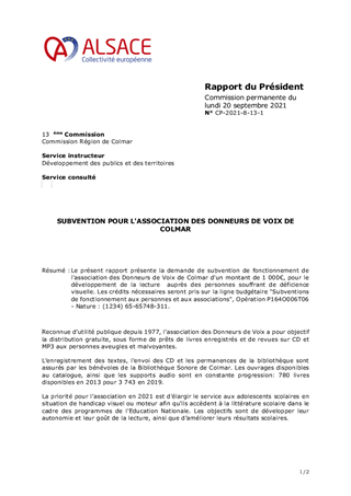 Le présent rapport présente la demande de subvention de fonctionnement de l'association des Donneurs de Voix de Colmar d'un montant de 1 000€, pour le développement de la lecture auprès des personnes souffrant de déficience visuelle. Les crédits nécessaires seront pris sur la ligne budgétaire "Subventions de fonctionnement aux personnes et aux associations", Opération P164O006T06 - Nature : (1234) 65-65748-311.