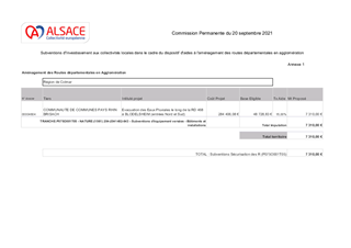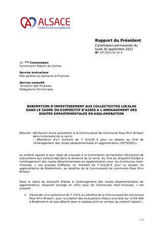Attribution d'une subvention à la Communauté de communes Pays Rhin Brisach dans le domaine de la voirie. - Affectation d'un montant de 7 310,00 € pour un dossier au titre de l’aménagement des routes départementales en agglomération (P075O001).