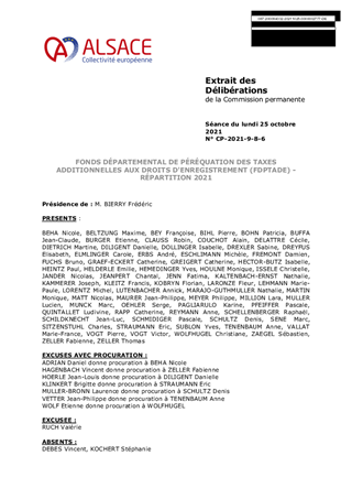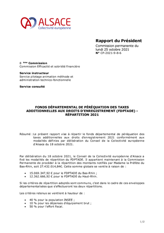 Le présent rapport vise à répartir le fonds départemental de péréquation des taxes additionnelles aux droits d'enregistrement 2021 conformément aux modalités définies par délibération du Conseil de la Collectivité européenne d'Alsace du 18 octobre 2021.
