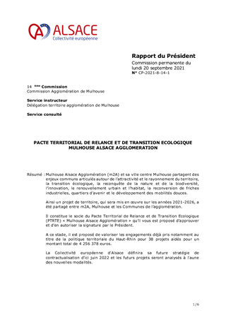 Mulhouse Alsace Agglomération (m2A) et sa ville centre Mulhouse partagent des enjeux communs articulés autour de l’attractivité et le rayonnement du territoire, la transition écologique, la reconquête de la nature et de la biodiversité, l’innovation, le renouvellement urbain et l’habitat, la reconversion de friches industrielles, quartiers d’avenir et le développement des mobilités douces. Ainsi un projet de territoire, qui sera mis en œuvre sur les années 2021-2026, a été partagé entre m2A, Mulhouse et les Communes de l’agglomération. Il constitue le socle du Pacte Territorial de Relance et de Transition Ecologique (PTRTE) « Mulhouse Alsace Agglomération » qu’il vous est proposé d’approuver et d’en autoriser la signature par le Président. A ce stade, il est proposé de valoriser les engagements déjà pris notamment au titre de la politique territoriale du Haut-Rhin pour 38 projets aidés pour un montant total de 4 256 378 euros. La Collectivité européenne d'Alsace définira sa future stratégie de contractualisation d'ici juin 2022 et les futurs projets seront analysés à l'aune des nouvelles modalités.